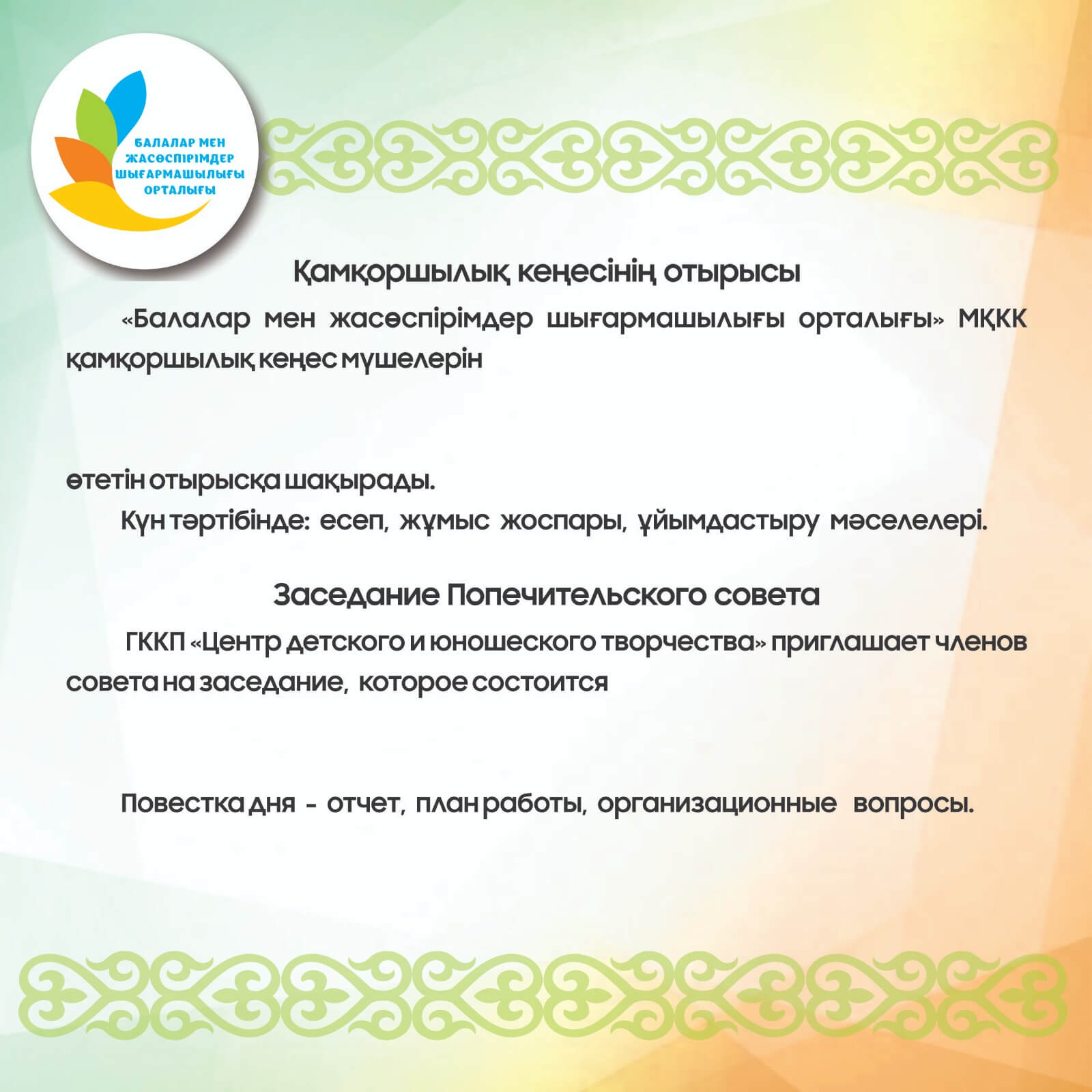 2024 жылдың 12 қазанында «Балалар мен жасөспірімдер шығармашылығы орталығы» МҚКК -да Қамқоршылық кеңес мүшелерінің кезекті отырысы өтті. Орталықтың м.а.директоры Ш.Н. Жеткергенова қамқоршылық кеңес мүшелерін 95-жылдық мерейтойына дайындық жұмыстарымен таныстырды.